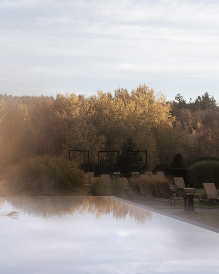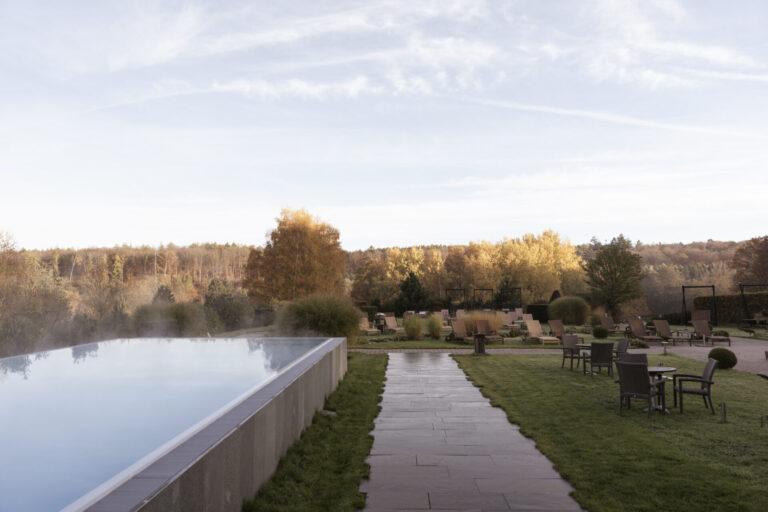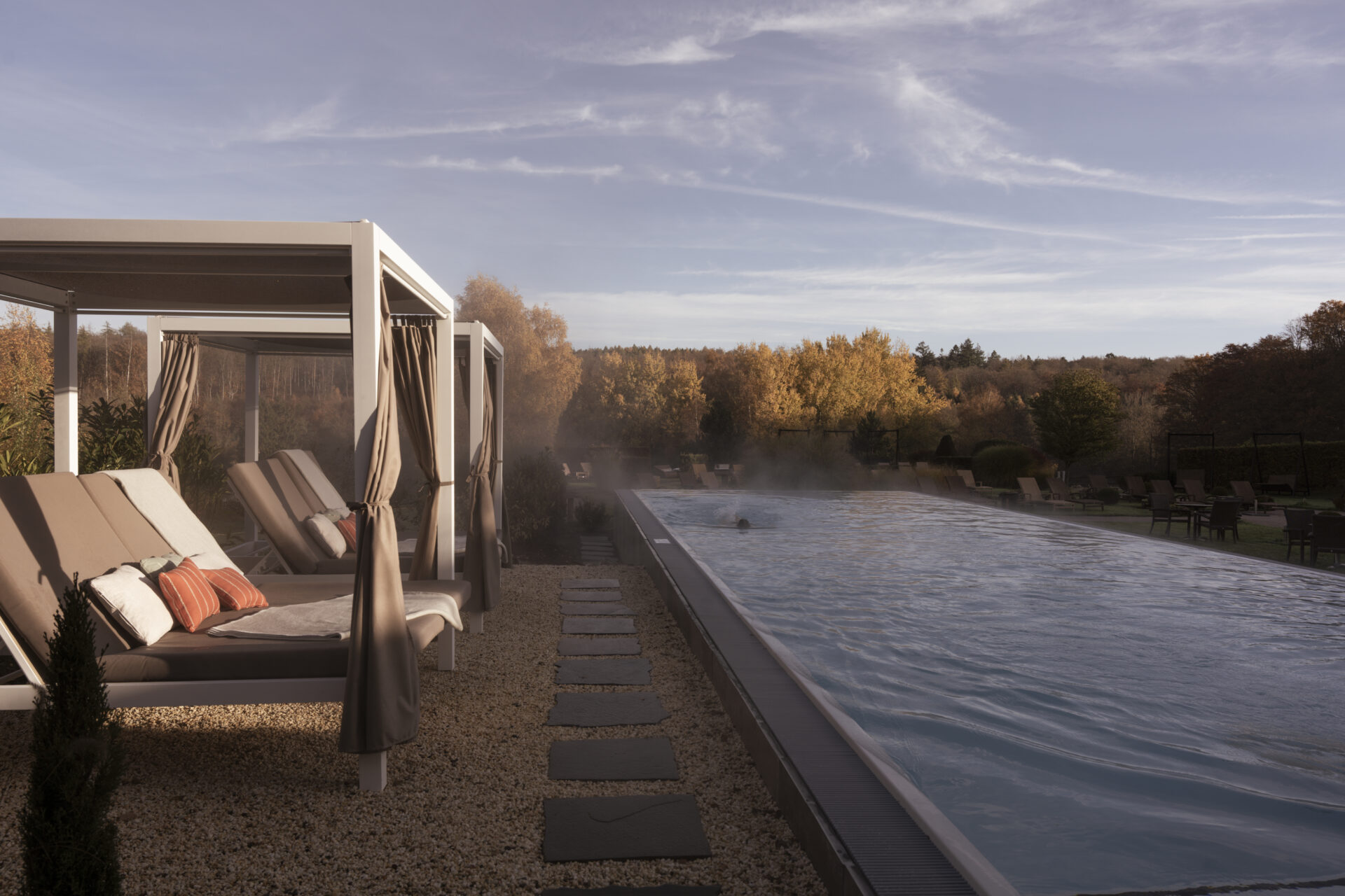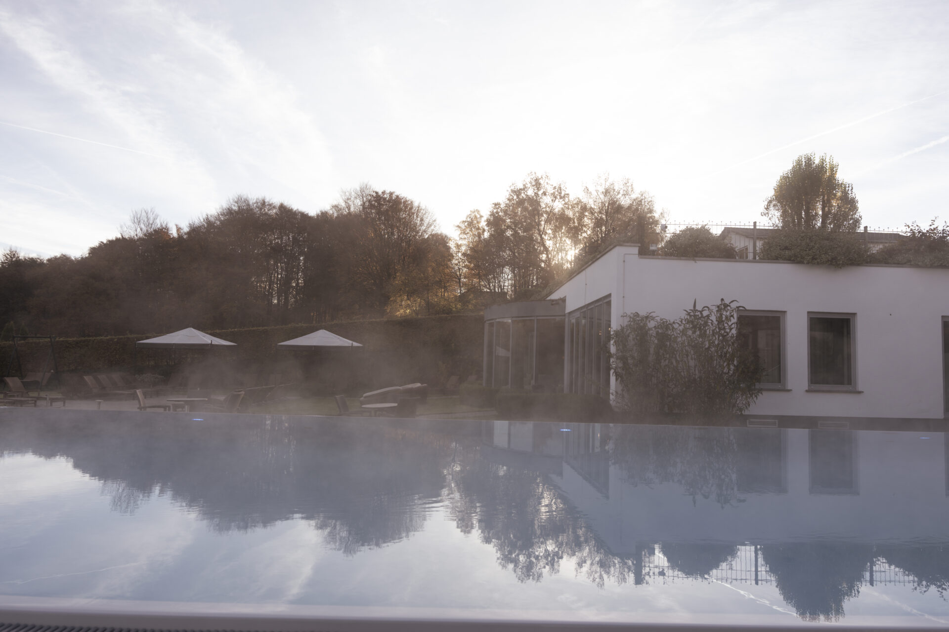 Der Außenpool: Infinity-Pool mit Liegestühlen und Sonnenschirmen, umgeben von Grün unter einem bewölkten Himmel bei Sonnenuntergang.
