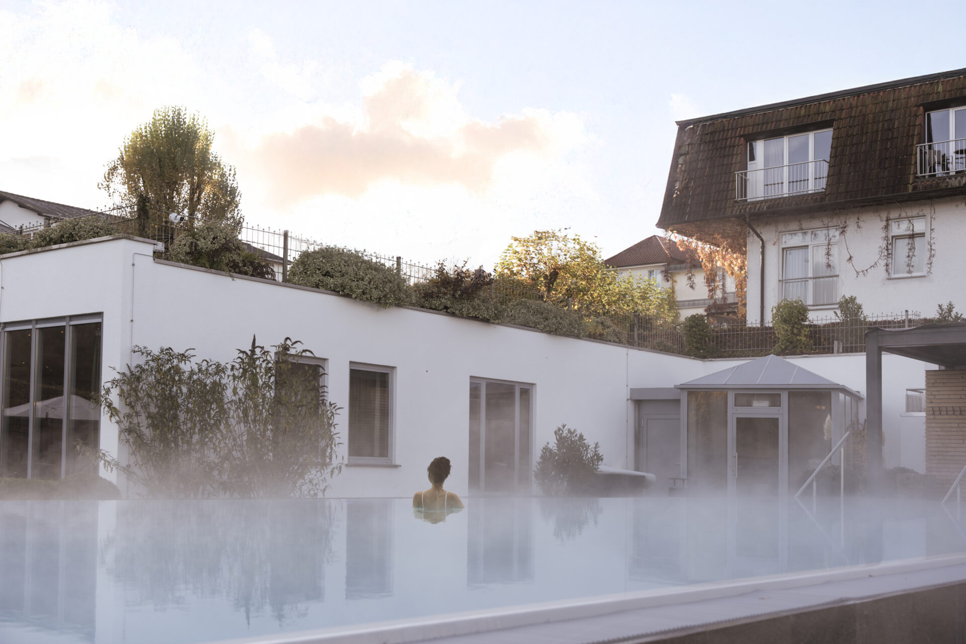 Der Pool liegt direkt am Ausgang der Sauna-Landschaft zum Garten mit