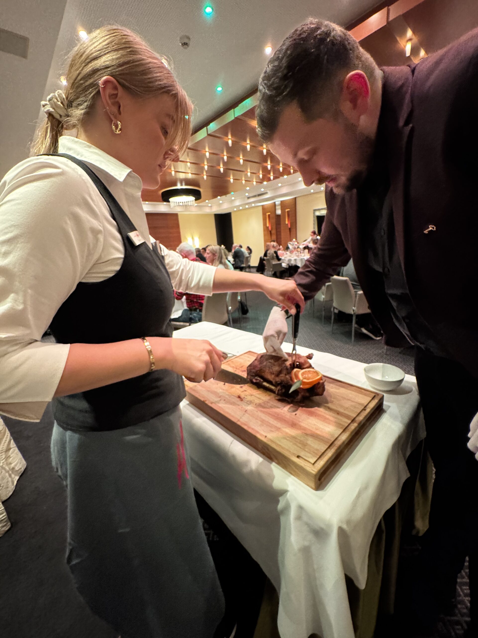 Die angehenden Restaurantfachleute übernahmen den Service, während die Koch-Lehrlinge entsprechen hinter den Kulissen ihre Vorbereitungen trafen. Nach einer herbstlichen Vorspeise ging es an den Hauptgang: ganze Gänsebraten wurden in den Saal getragen, und auf vier Stationen zerteilt.